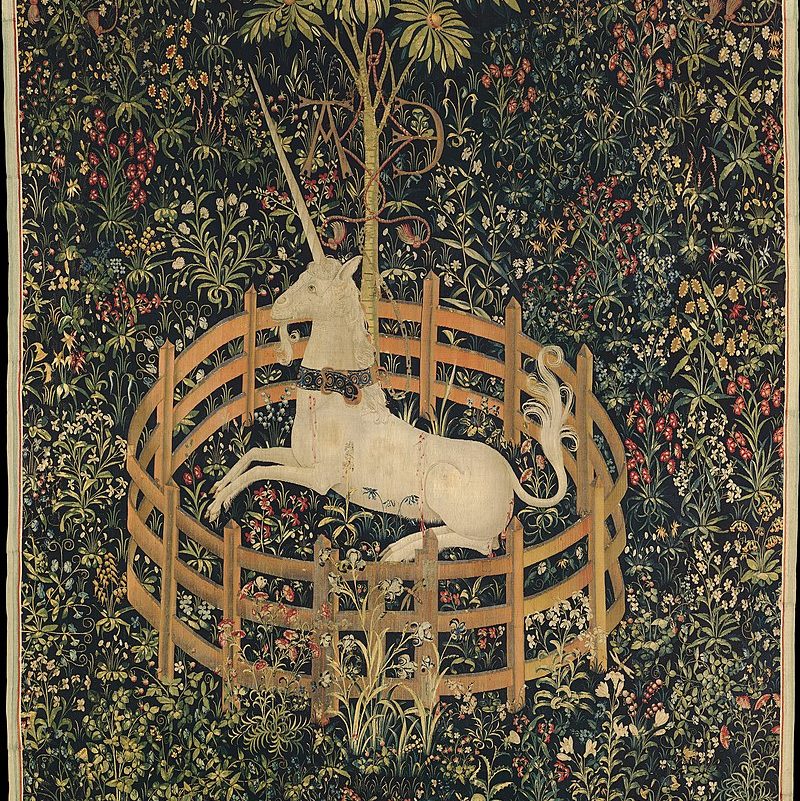 In the tapestries of The Hunt for the Unicorn (Above – Met Museum of Art), widely believed to be 15th Century Dutch, the wild unicorn must be captured by a virgin. The idea of taming the wild with some kind of symbol of purification is often found within these myths. Interestingly, in this series of tapestries the unicorn is captured and killed, but then is mysteriously alive again in the final tapestry, but controlled and held captive.